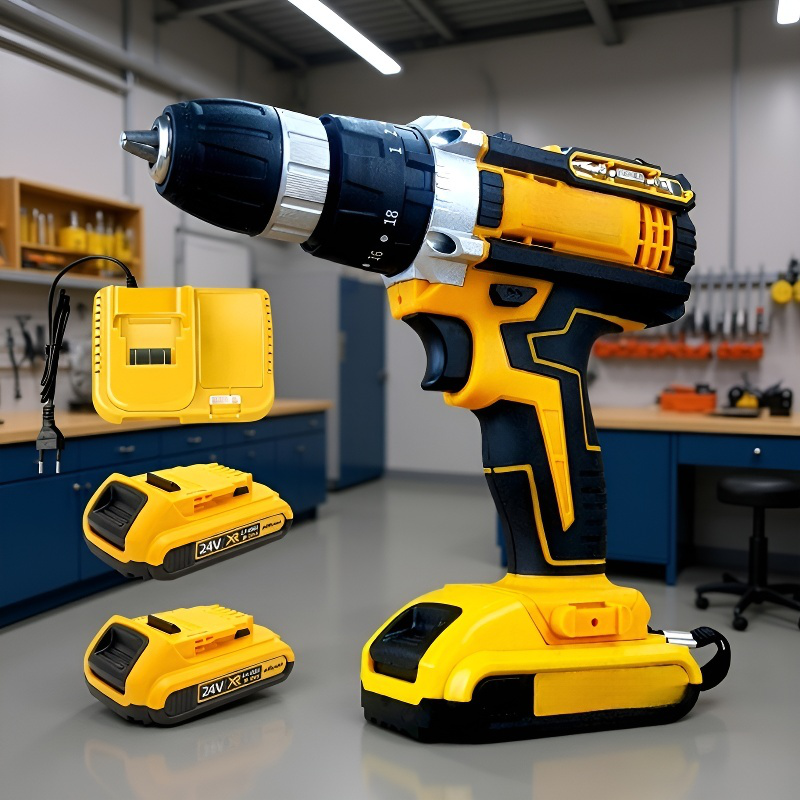 24V-os sárga akkumulátoros szerszámcsomag, elektromos fúrógéppel